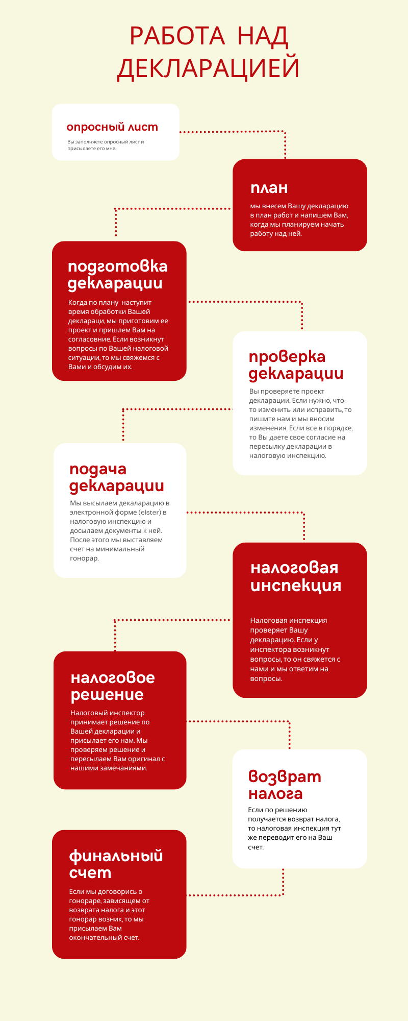 Если Вы хотите подать декларацию с моей помощью, то скачайте опросный лист , заполните его и пришлите мне по электронной почте. Либо Вы можете загрузить документы в облачное хранилище TeamDrive. Напишите мне, если Вам это интересно, и создам для Вас личную папку в TeamDrive.